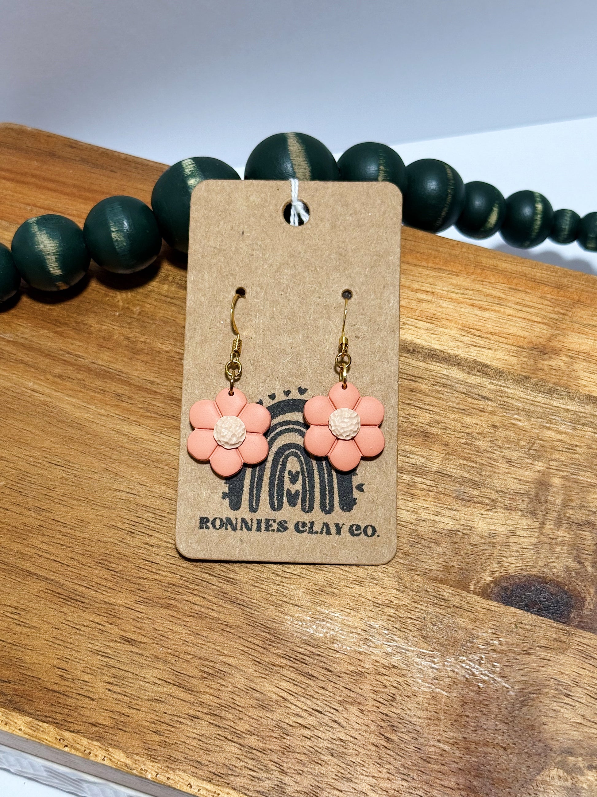 Coral-colored flower dangle earrings made of polymer clay and assembled with brass hooks.